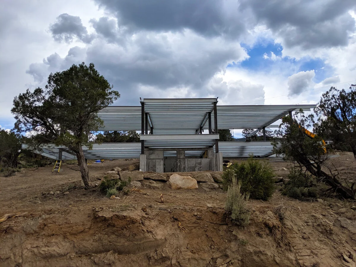Perched on a remote and beautiful property in Bond, CO, this home captures both the grandeur of the views towards the Colorado River and Flat Tops beyond, while simultaneously connecting the owners to the intimacy of the pinion forest. The steel Blue Sky Building System was used to lightly elevate the house above the sloped topography for minimal disturbance. On the main level, double master bedrooms and baths connect to an open living and kitchen via light filled galleries that house supplemental spaces. The circulation happens around a warm, birch clad “core” while exterior walls and the ceiling are kept white. Large windows frame the picturesque views.